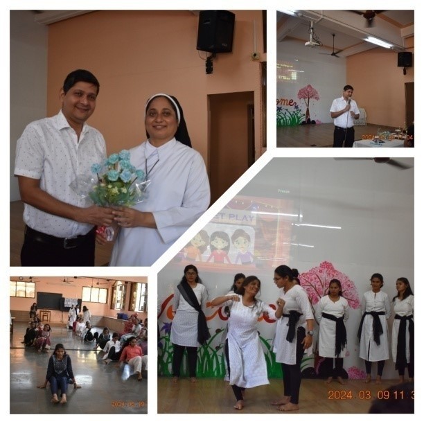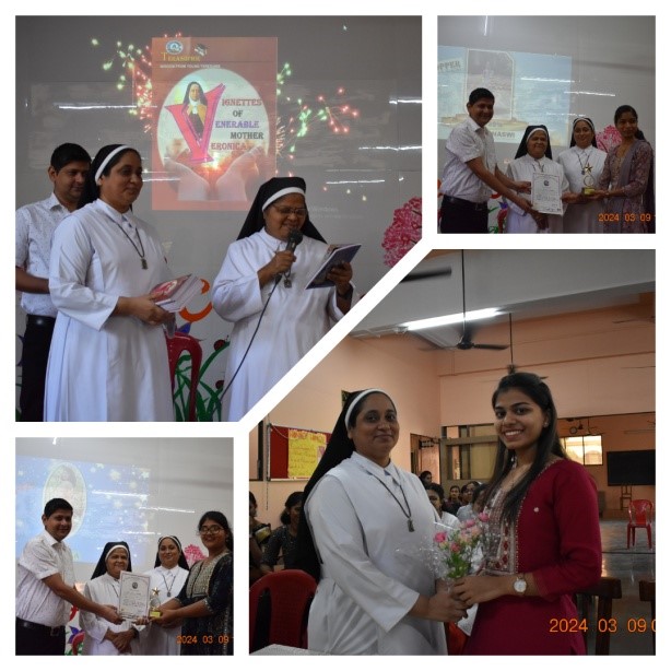 The celebration began with an assembly led by the top achievers of the academic years 2021-23, followed by a motivational address from Ruchira Machado. As our two esteemed guests arrived, we commenced our programme with a prayer dance. Subsequently, the rankers were felicitated by Fr. Glen D'mello. Our principal, Sr. Saroja, shared insights about the book "Vignettes of Venerable Mother Veronica", which was released by Rev. Sr. Louella Rodriguez. Fr. Glen D'mello delivered an inspiring talk on how to become impactful teachers. Throughout the programme, there were also spontaneous games. Later, a street play on women's rights was performed by the Agnes Group. Following this, the winners of various competitions, including sports events and teaching aids, were honoured.